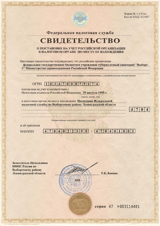 Свидетельство о постановке на налоговый учет (ОГРН)