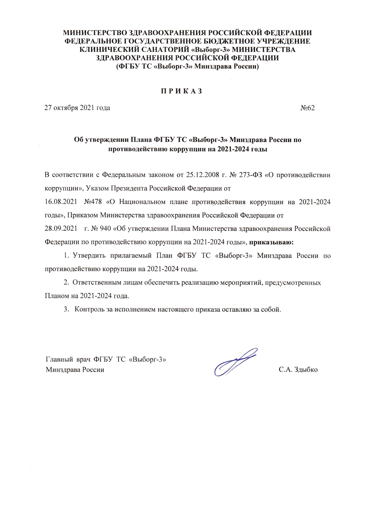 Приказ Минздрава России от 27 октября 2021 г. № 62 «Об утверждении Плана ФГБУ ТС «Выборг-3» Минздрава России по противодействию коррупции на 2021-2024 годы»